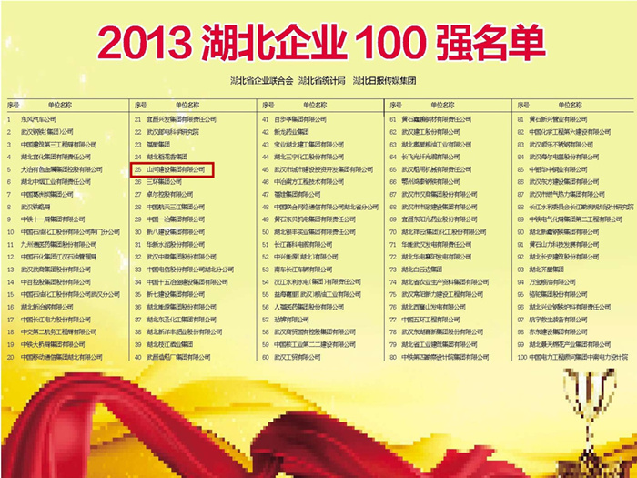 10月22日,2013湖北企业百强发布会、第十八届湖北省优秀企业、优秀企业家表彰大会暨八届二次会员代表大会隆重举行。湖北省企业联合会、湖北省统计局和湖北日报传媒集团联合发布了2013湖北企业100强名单,九游网页版·官方版在线入口集团位列湖北百强企业第25位并荣获“第十八届湖北省优秀企业(金鹤奖)”。九游网页版·官方版在线入口集团董事长程理财同时被湖北省企业联合会和湖北省企业家协会联合授予“第十八届湖北省优秀企业家(金牛奖)”荣誉称号。