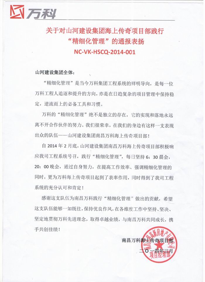 “感谢这支队伍为南昌万科践行精细化管理做出的贡献,希望这支队伍与南昌万科共同成长,携手共创佳绩!”近日,九游网页版·官方版在线入口集团海上传奇项目部收到了一封来自集团战略合作伙伴――万科地产的表扬信。