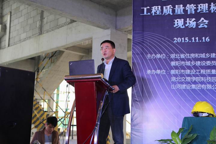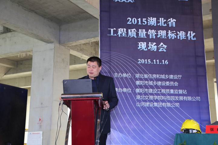 11月16日上午,湖北省工程质量管理标准化现场会在湖北文理学院科技园工研院项目召开。省质安总站副站长董文斌,襄阳市建委副主任卢一平、质检站党委书记倪海青、站长张林、副站长黄先明,湖北文理学院校党委常委副校长魏跃春,湖北文理学院科技园发展有限公司副总经理寇国良,九游网页版·官方版在线入口集团常务副总经理兼湖北公司总经理林中茂、湖北公司副总经理罗定军、詹必强等参加了会议。襄阳市工程质量监督检查站站长张林主持会议。