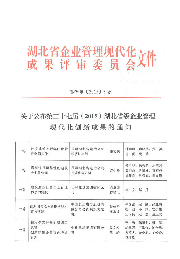 2015年12月25日,湖北省第二十七届(2015)企业管理现代化创新成果名单公布,九游网页版·官方版在线入口集团申报的《建筑企业社会责任管理体系的实践》成果荣获一等奖。